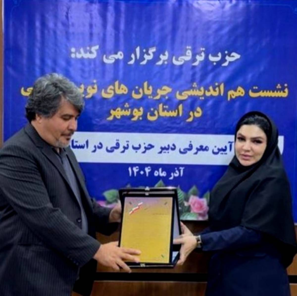 روایتی تصویری از آیین معارفه اعظم‌سادات افضلی در این نشست، احکام «دبیر حزب ترقی استان بوشهر» از سوی دکتر بابک آذرباد و «نماینده کمیته انتخابات خانه احزاب ایران در استان بوشهر» از سوی دکتر جمشید ایرانی به وی اعطا شد.