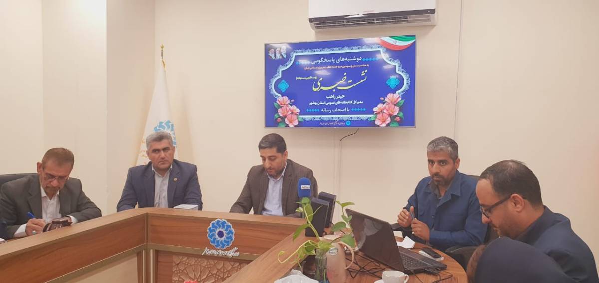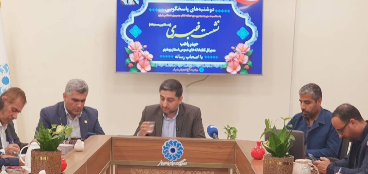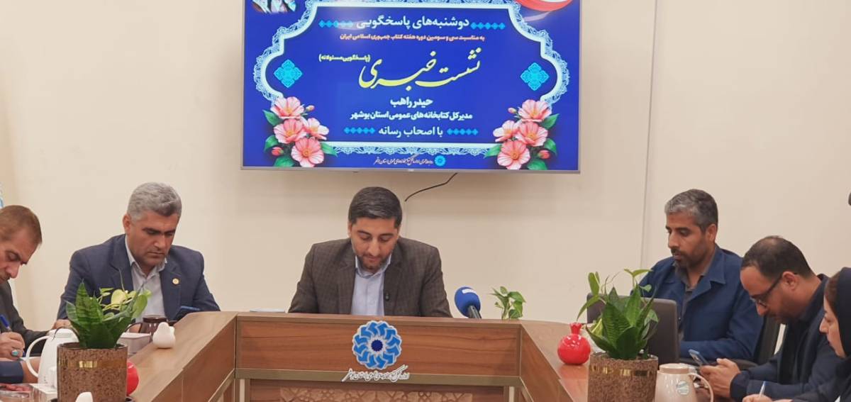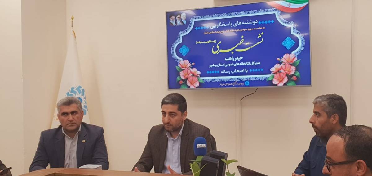 نشست خبری مدیرکل کتابخانه‌های عمومی استان بوشهر با حضور اصحاب رسانه، به‌منظور تشریح برنامه‌ها و ویژه‌برنامه‌های سی‌وسومین دوره هفته کتاب جمهوری اسلامی ایران، هم‌اکنون در محل اداره کل کتابخانه‌های عمومی استان برگزار شد
