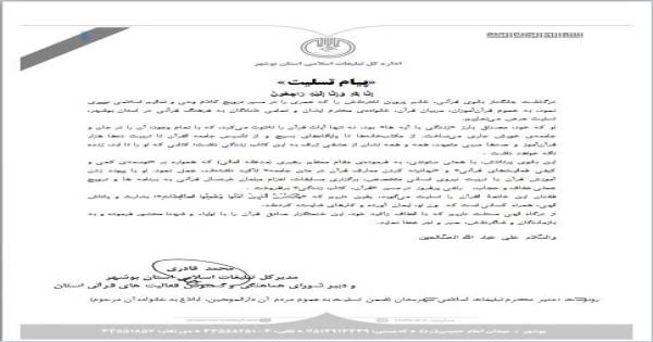 «با نهایت تأسف و تأثر ضایعه درگذشت برادر گرامیتان، مرحوم مغفور آقای حاج عباس احمدی (رضوان الله علیه) را خدمت جنابعالی و خانواده محترم تسلیت عرض نموده، برای آن مرحوم از درگاه خداوند منان غفران و رحمت واسعه الهی و برای جنابعالی و بازماندگان صبر و سلامتی مسئلت دارم.»