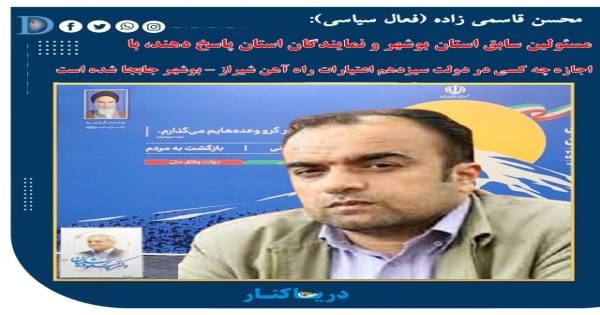 رادیو دریاکنار - محسن قاسمی زاده (فعال سیاسی): مسئولین سابق استان بوشهر و نمایندگان استان پاسخ دهند، با اجازه چه کسی در دولت سیزدهم اعتبارات راه آهن شیراز – بوشهر جابجا شده است؟ پاسخگو باشید...