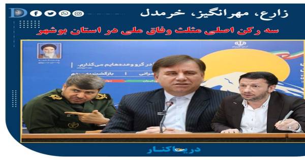 دکتر ارسلان زارع (استاندار)، دکتر مهدی مهرانگیز (رئیس کل دادگستری) و سردار حمید خرمدل (فرمانده سپاه استان) سه رکن اصلی مثلث وفاق ملی در استان بوشهر هستند