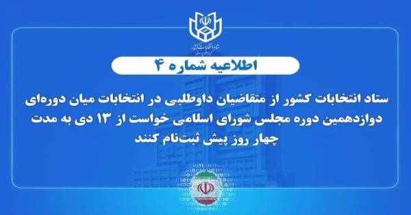 اعلام زمان پیش ثبت‌نام انتخابات میان دوره‌ای مجلس شورای اسلامی ستاد انتخابات کشور در اطلاعیه شماره ۴ از متقاضیان داوطلبی در انتخابات میان دوره‌ای دوازدهمین دوره مجلس شورای اسلامی خواست از ۱۳ دی به مدت چهار روز پیش ثبت‌نام کنند.